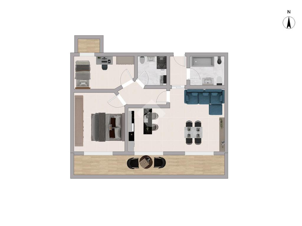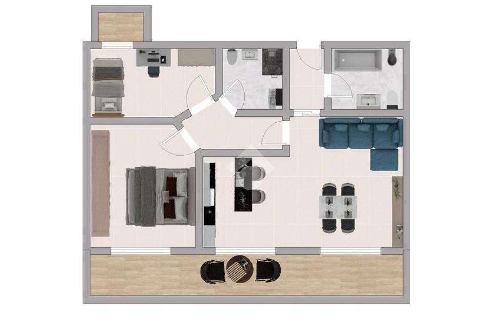 La zona giorno si apre su un ampio e luminoso soggiorno con accesso diretto al terrazzo, ideale per momento di relax all'aperto. La cucina è lasciata a vista e ben attrezzata.