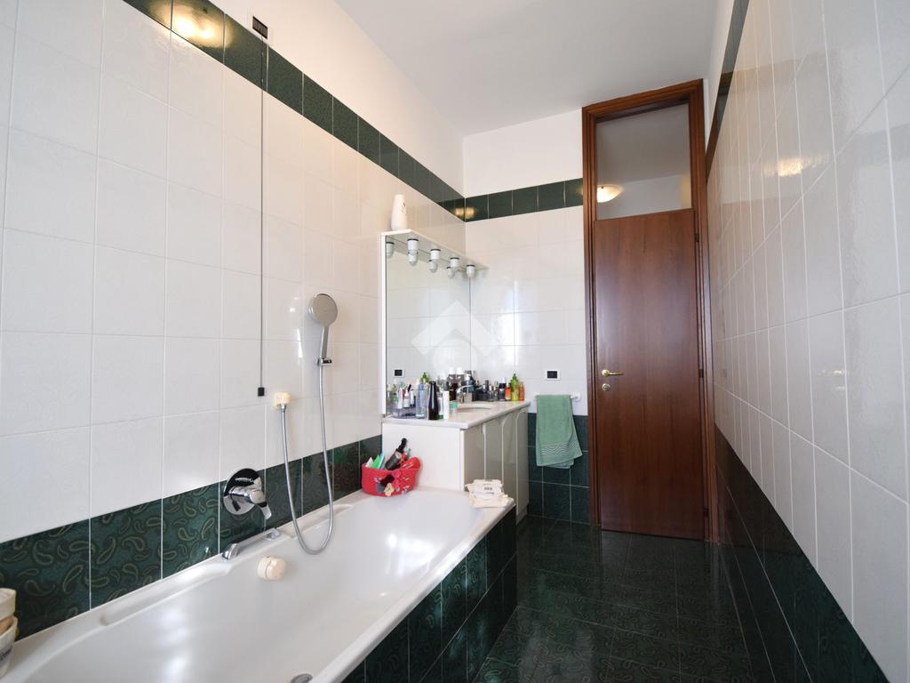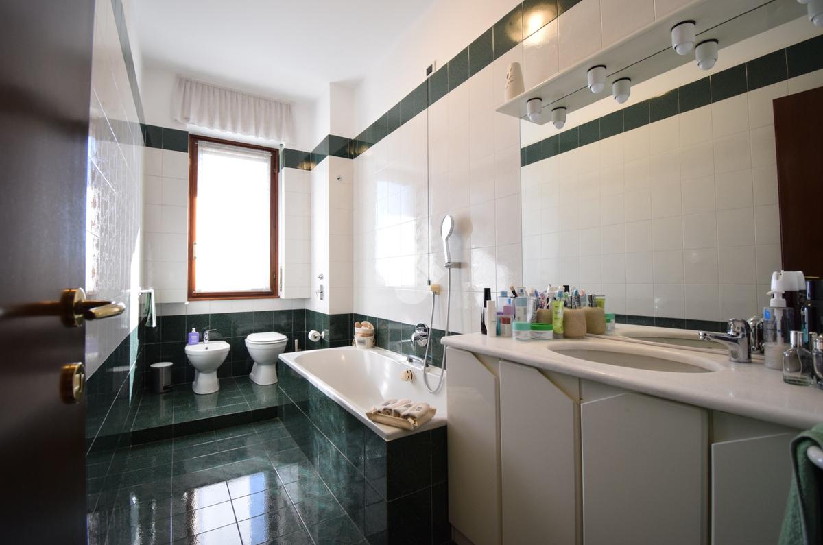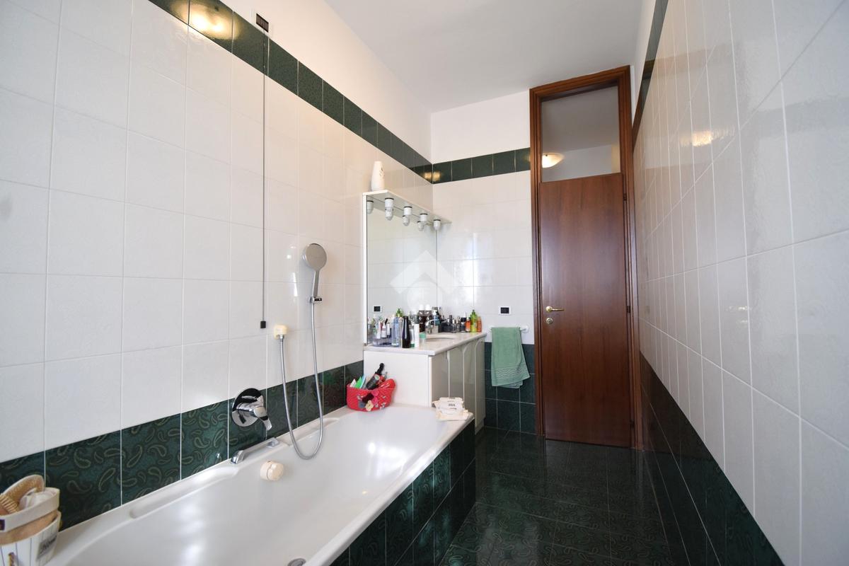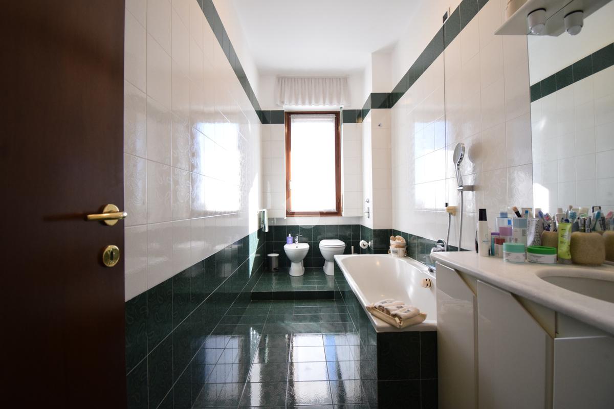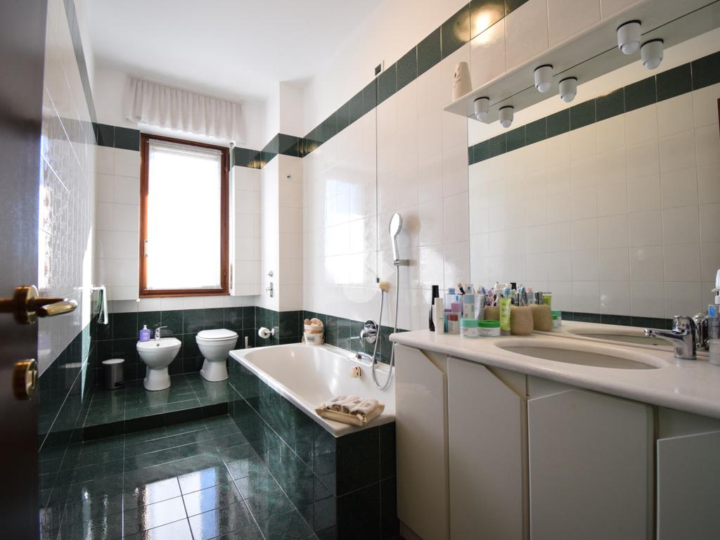 Un disimpegno, con ripostiglio, accompagna alla zona notte che comprende due camere, di cui una con uscita sul balcone. Bagno padronale con vasca.