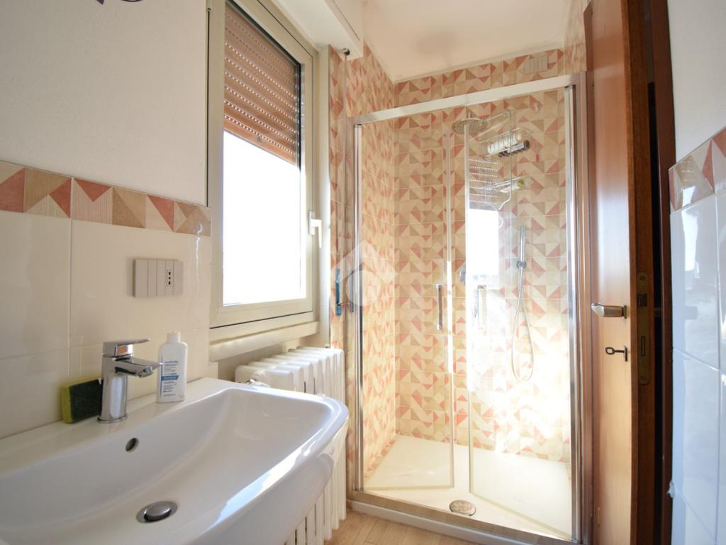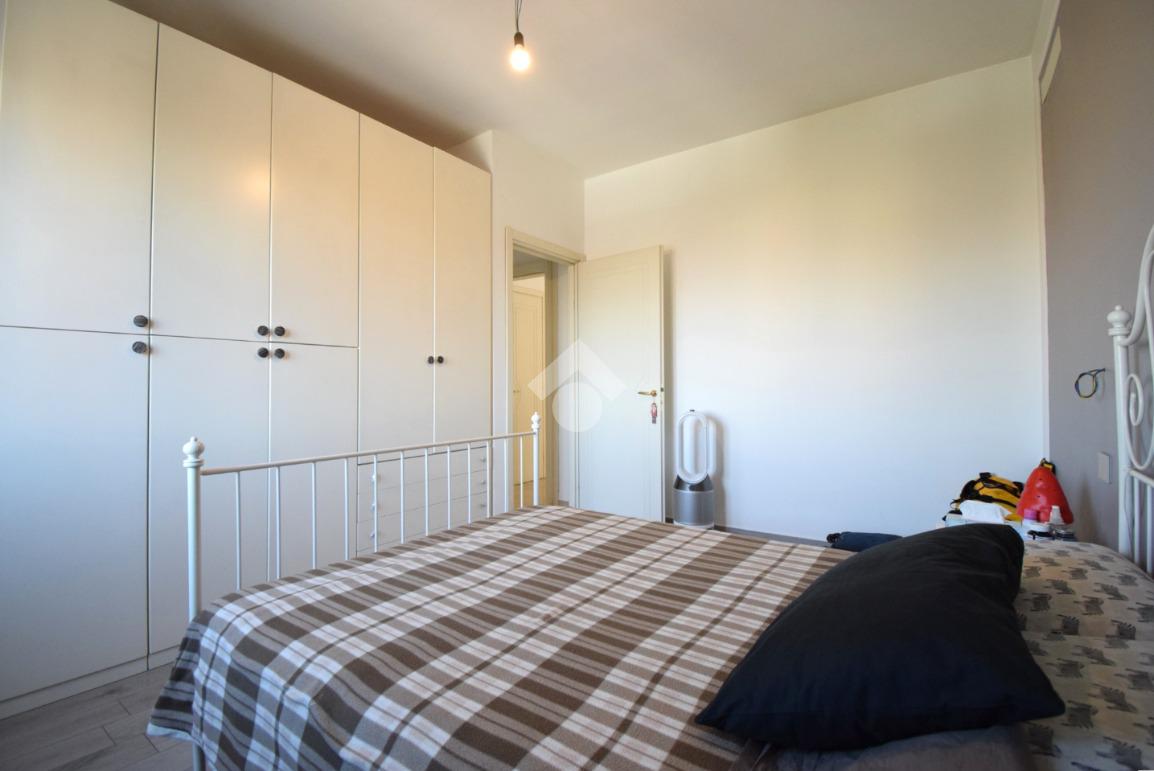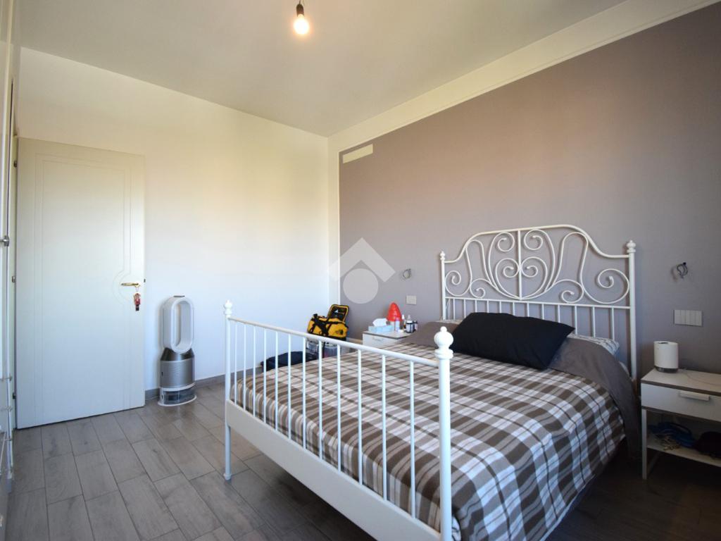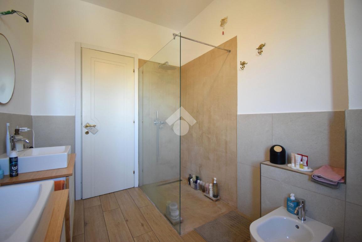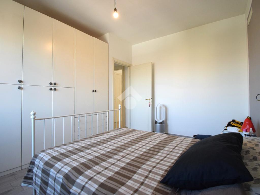 Un disimpegno conduce alla camera matrimoniale e al bagno finestrato con doccia.