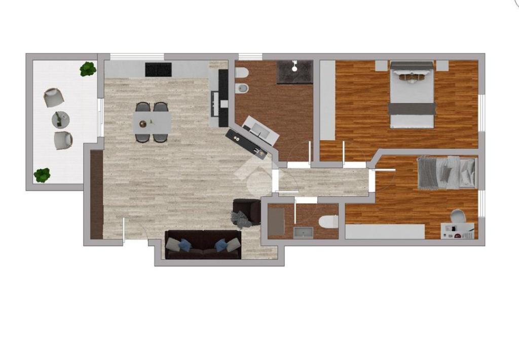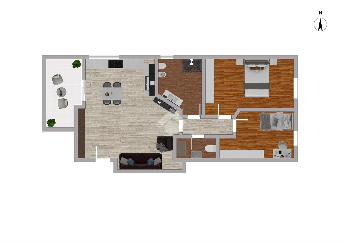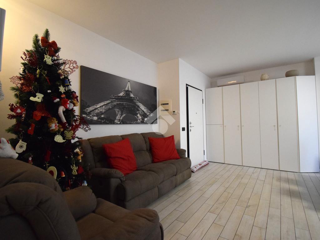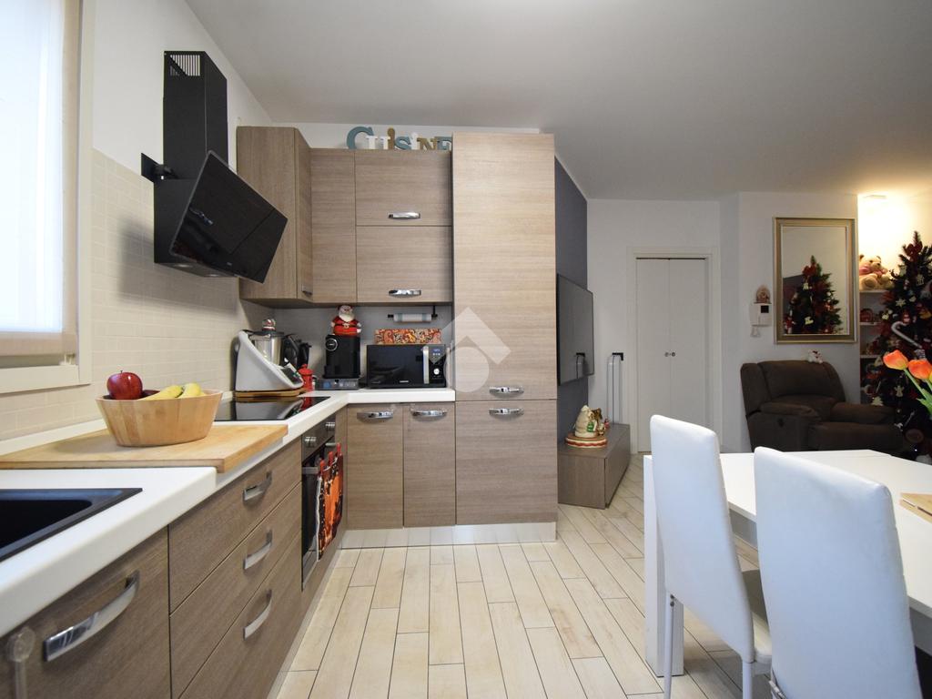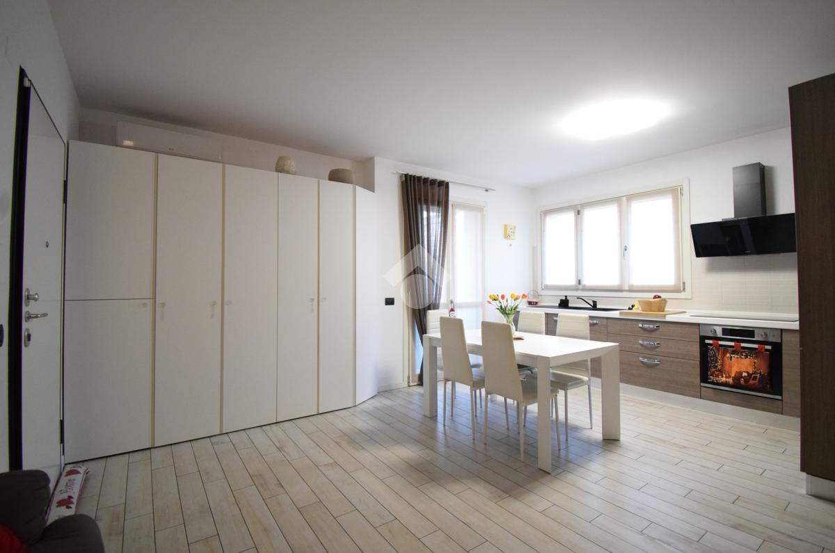 Entrando troviamo la zona giorno con cucina lasciata a vista e accesso diretto al terrazzino vivibile.