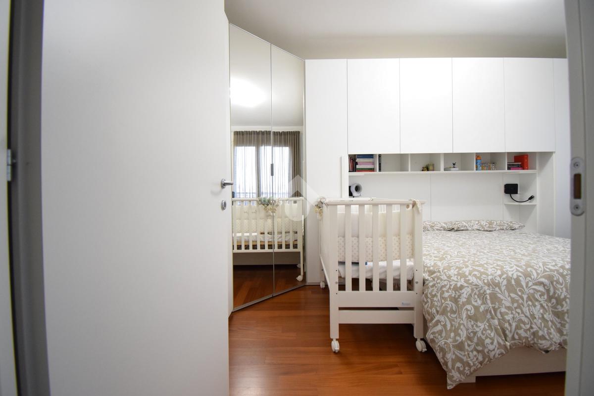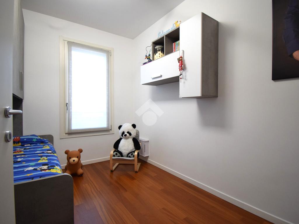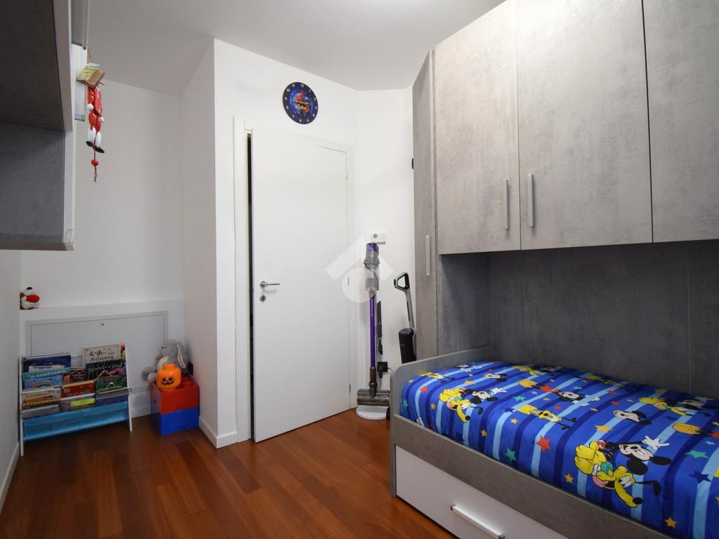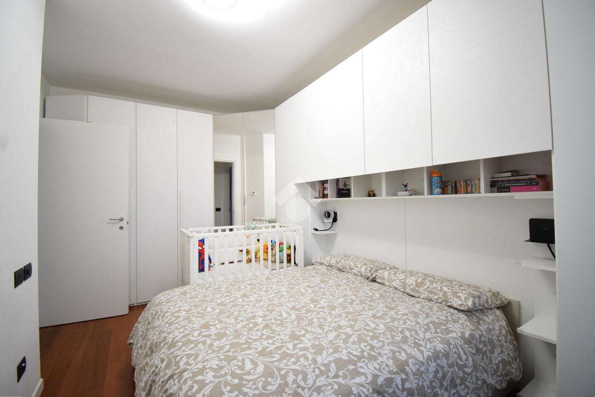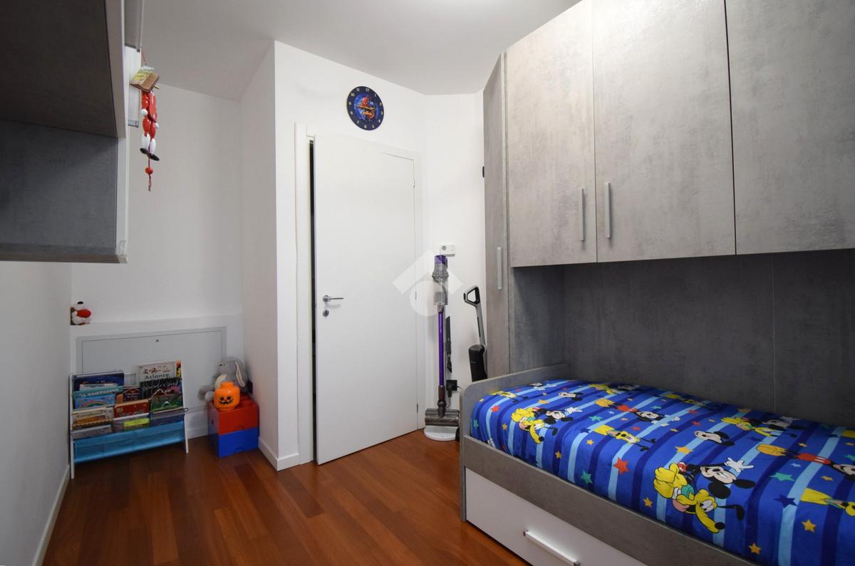 Un disimpegno accompagna alla camera matrimoniale e alla cameretta. Doppi servizi.