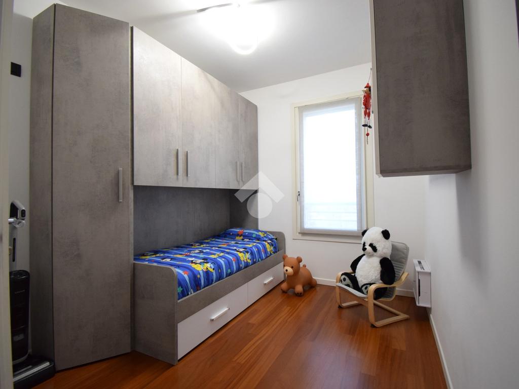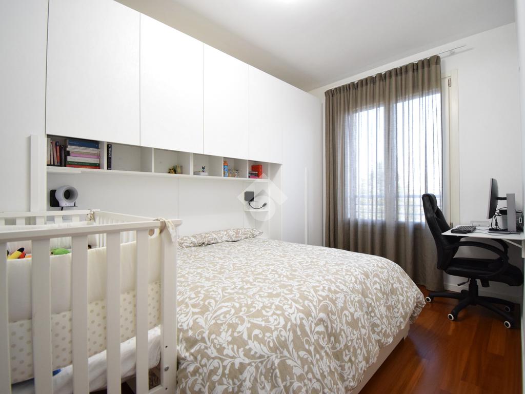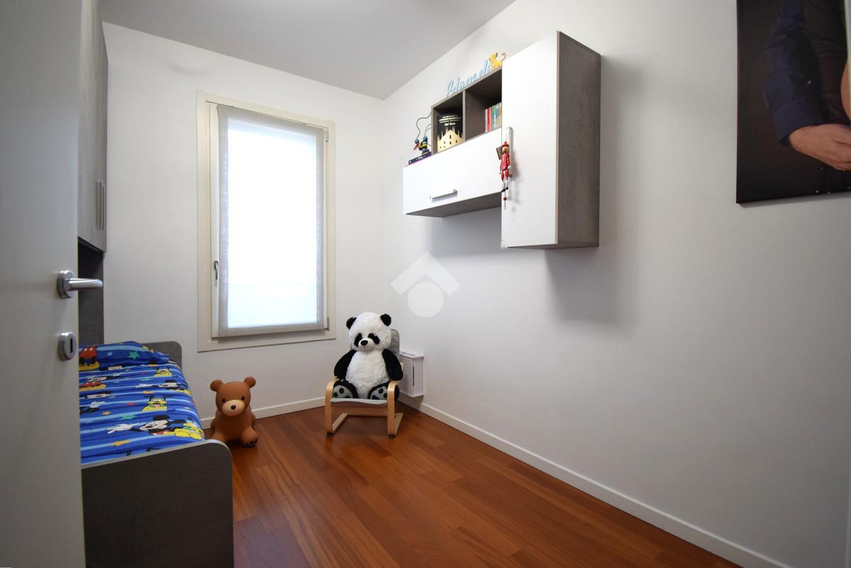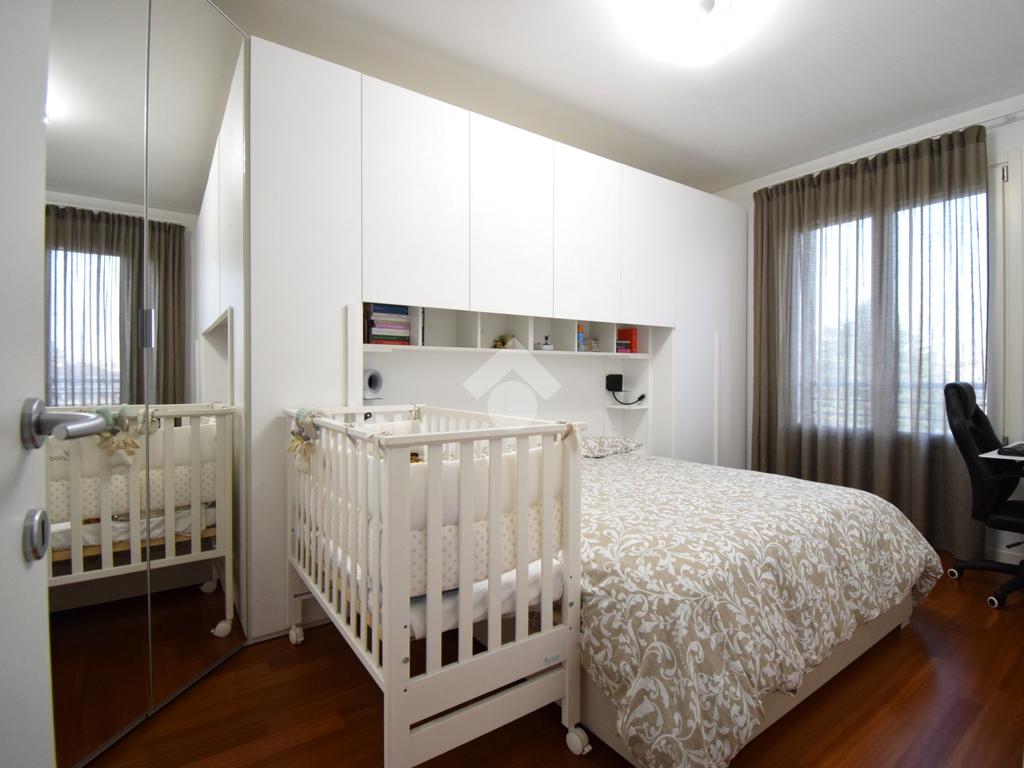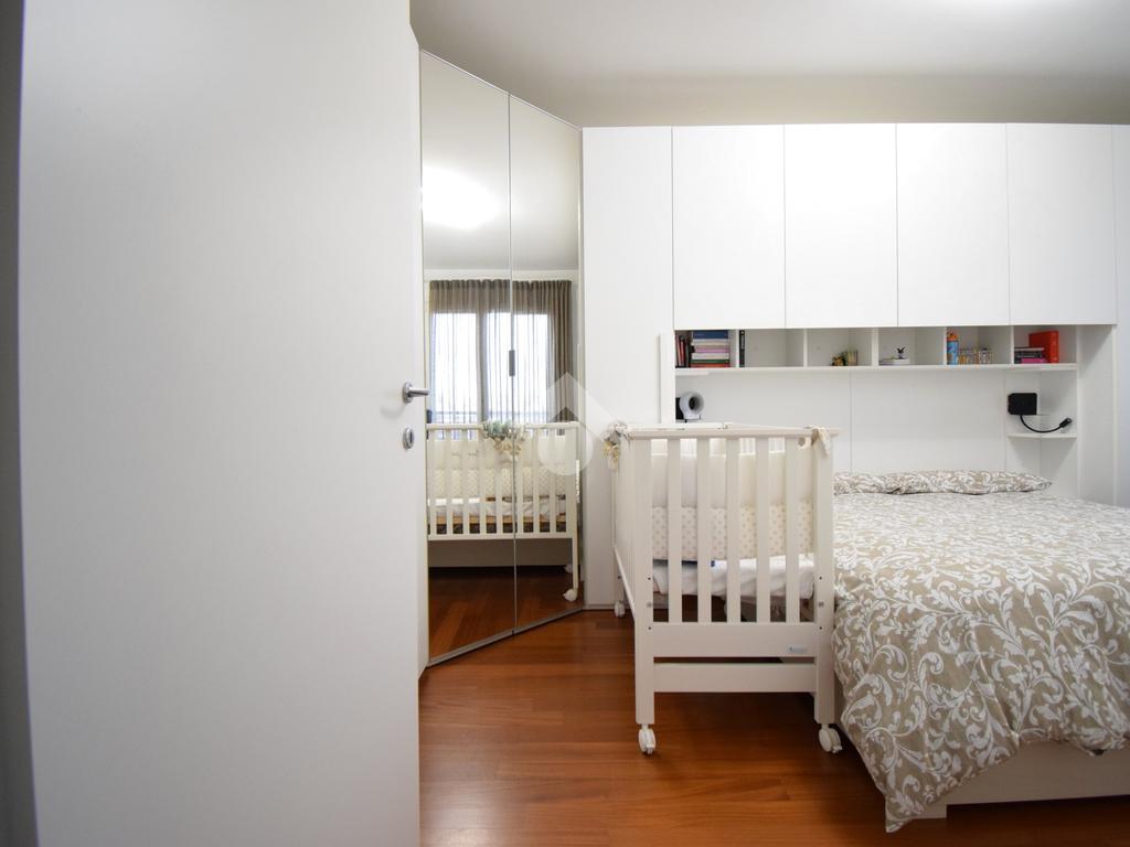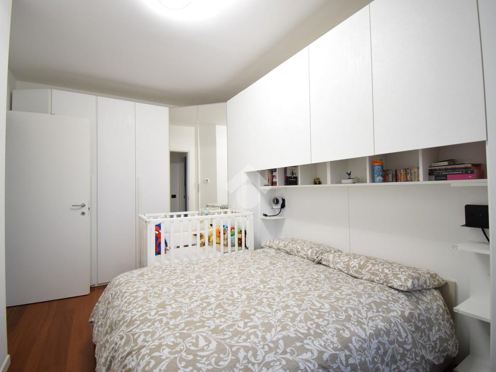 Un disimpegno accompagna alla camera matrimoniale e alla cameretta. Doppi servizi.