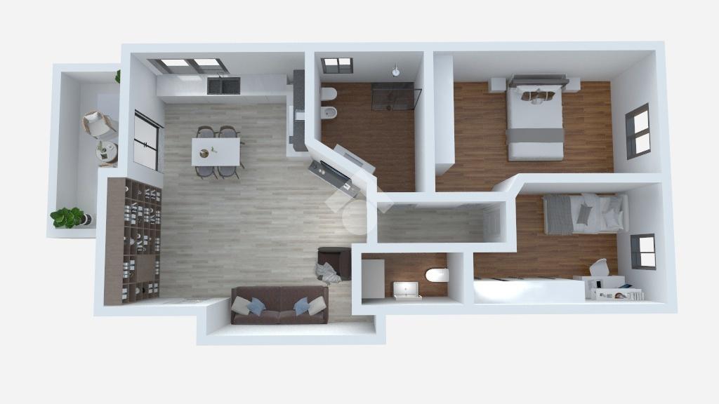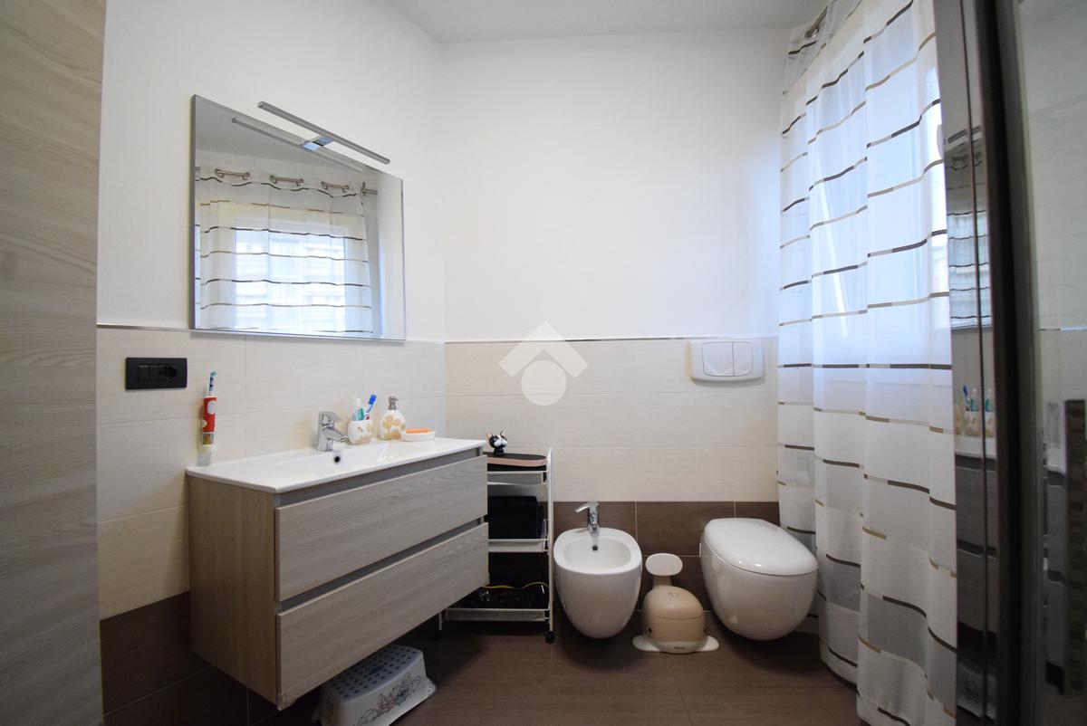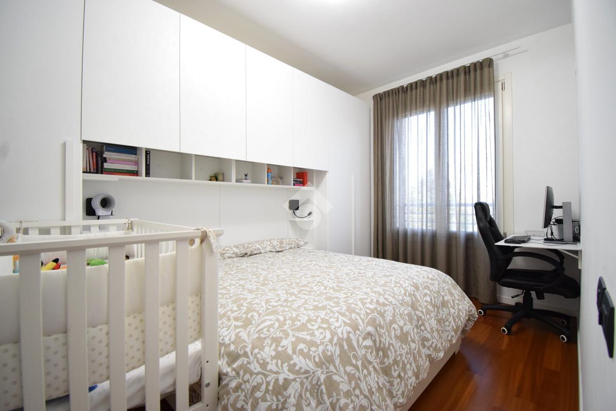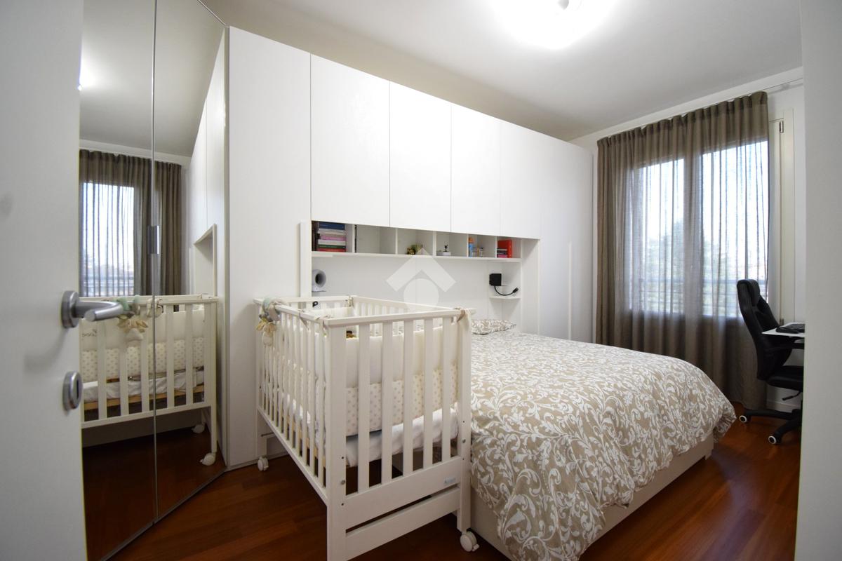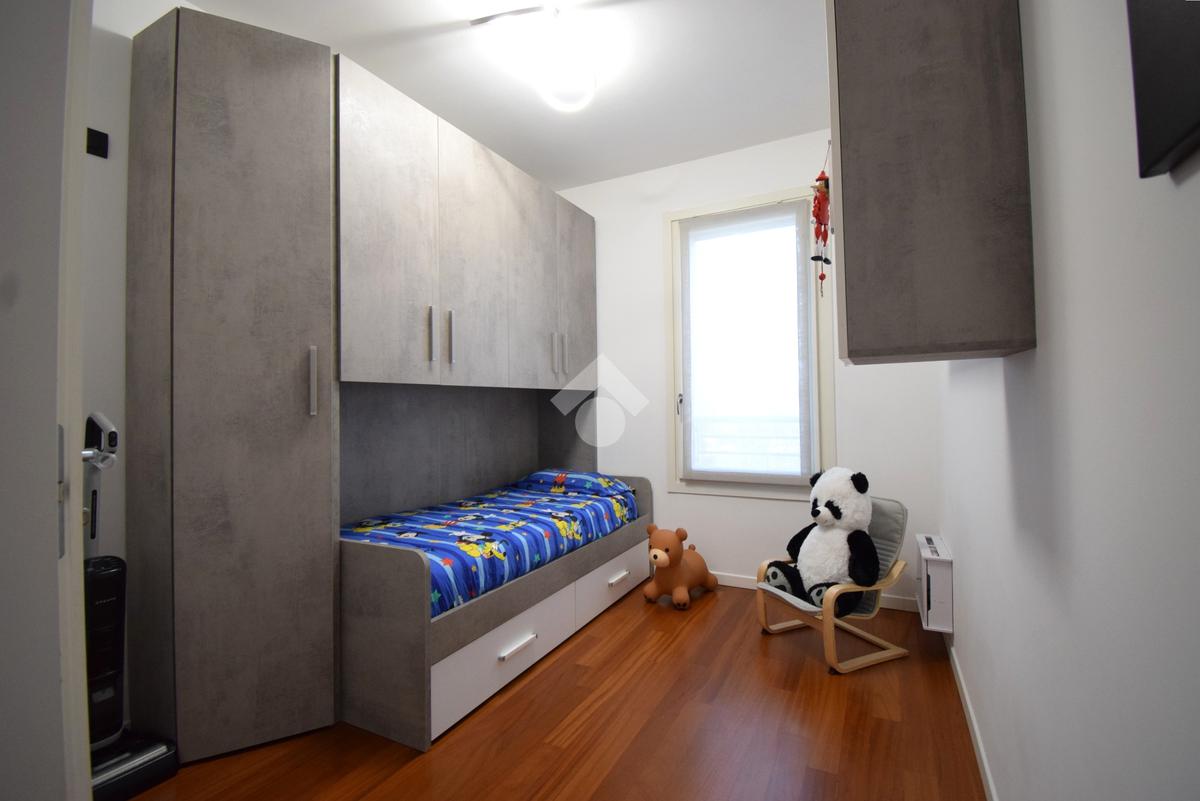 Un disimpegno accompagna alla camera matrimoniale e alla cameretta. Doppi servizi.