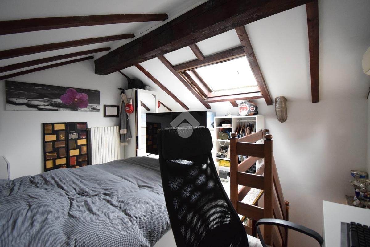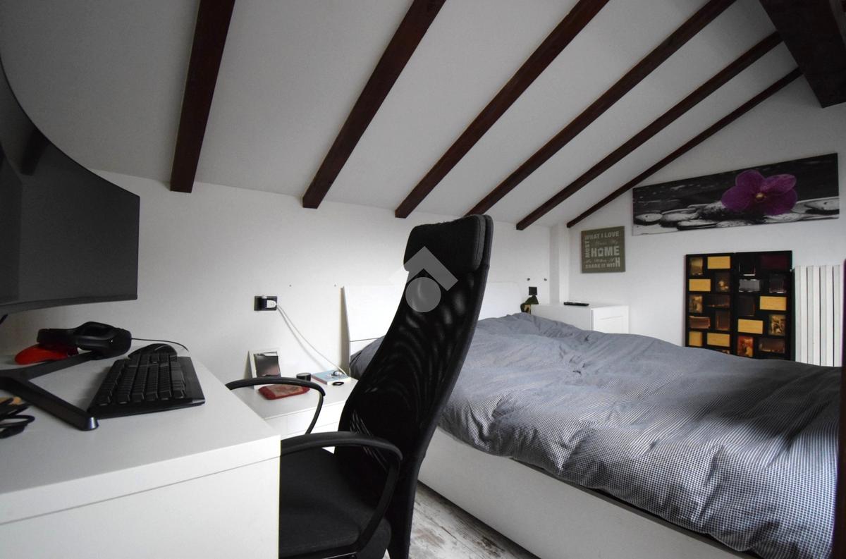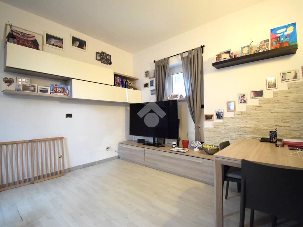 Disposto su due livelli, l'appartamento offre un ambiente accogliente e funzionale. Al piano terra, troviamo un luminoso soggiorno, cucina separata, il bagno finestrato con doccia ed uno studio attualmente adibito a cameretta.